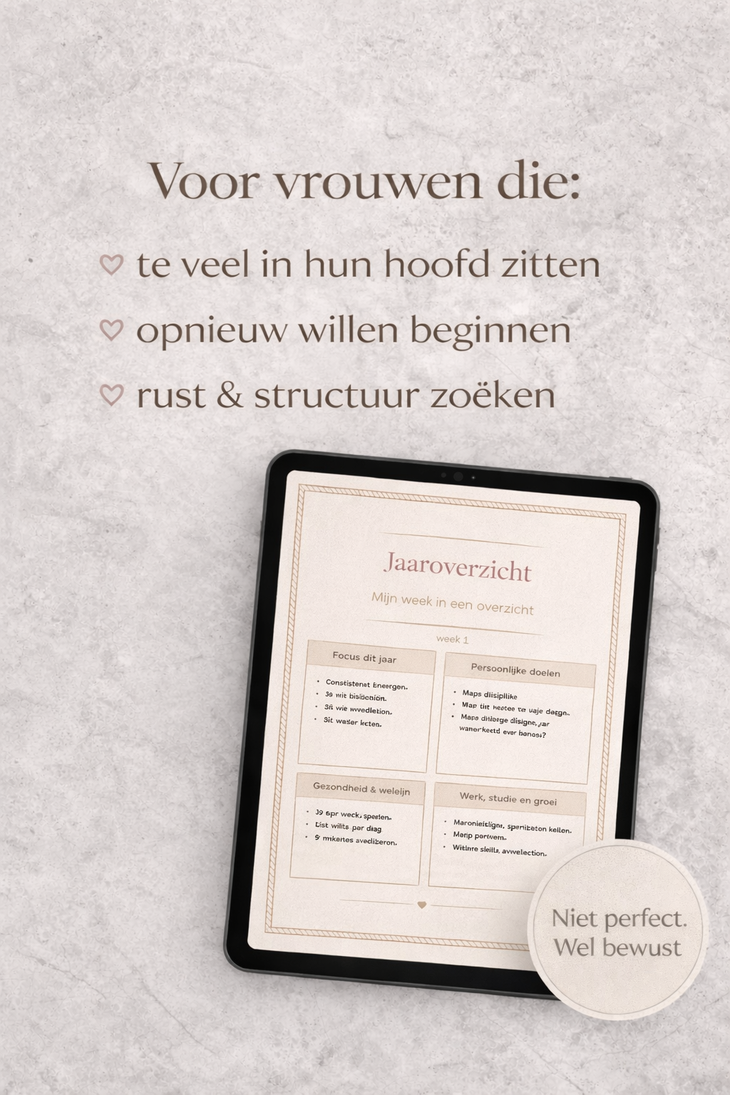 Geen druk, geen volle schema’s – maar bewust plannen op jouw tempo.
